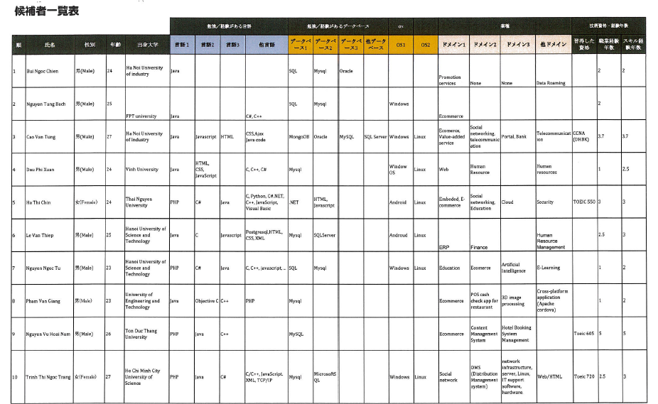 ベトナムのIT人材に着目しておりましたが、日本語がN2以上に話せて、かつ、IT業界での経験が1年以上ある人材が極端に少ないためにIT人材においてはベトナムをストップしました。